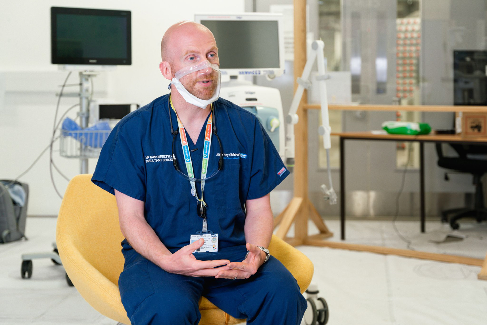 A Speech and Language Team member at Alder Hey, using the mask during one of their sessions